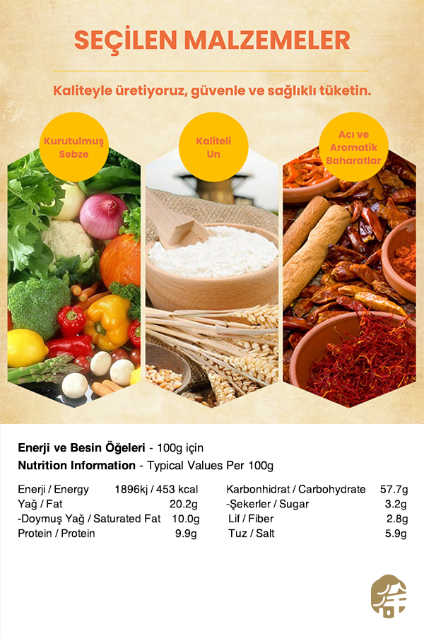 Spice Pack: Carrot Powder, Salt, Spice Seasoning (Red Pepper, Fennel, Star Anise), Flavor Enhancer (E621)